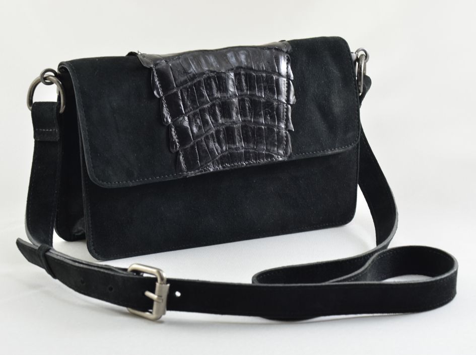 Bolsa confeccionada em couro camurça, pele de jacare aplicado na tampa, forro de gorgurão, com 2 bolsos interno sendo um bolso com ziper e outro sem ziper. Dimensões do produto , A: 15cm, L: 24cm, P: 6cm.