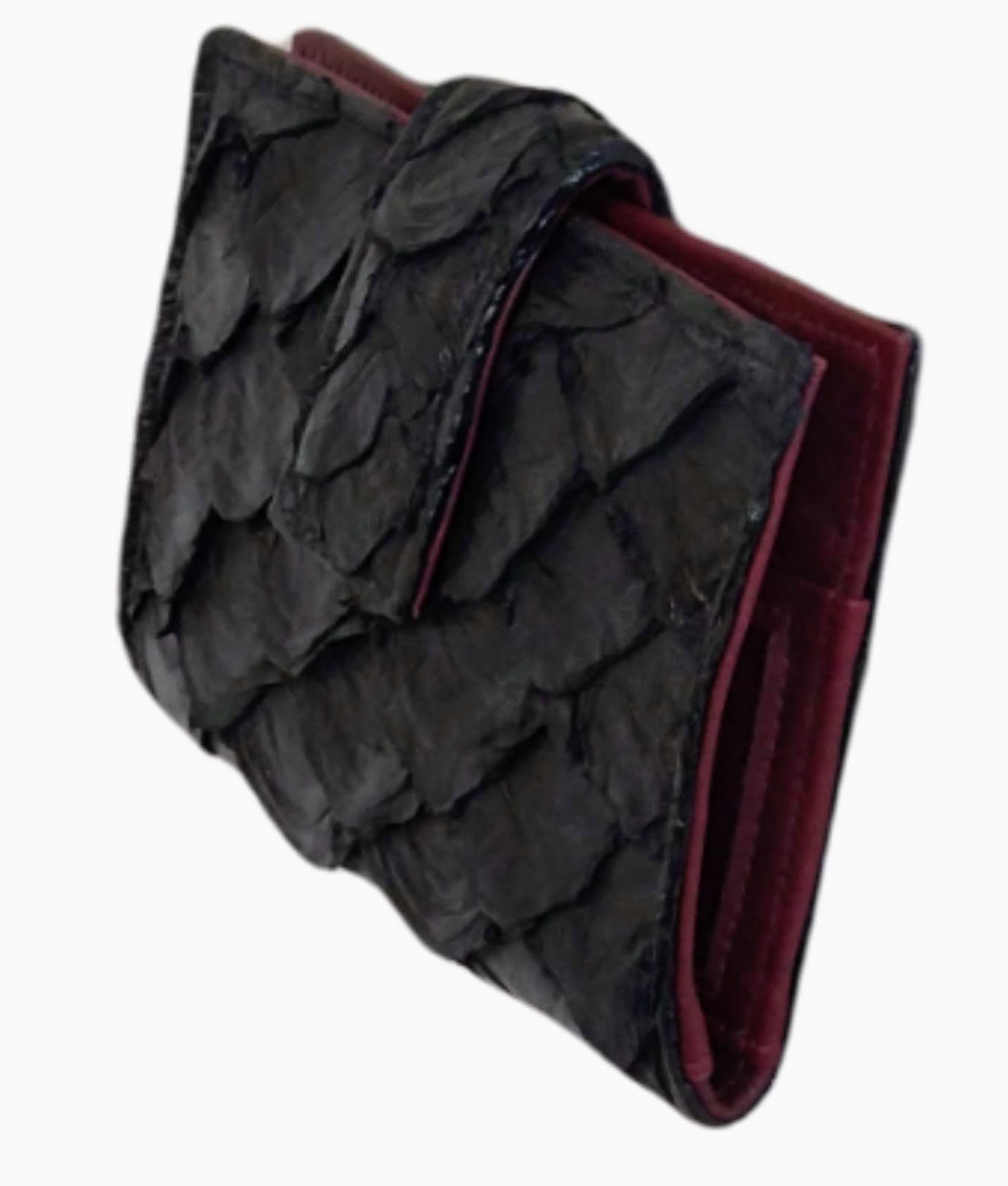 Carteira Lucy, confeccionada em pele de pirarucu com detalhes interno em couro