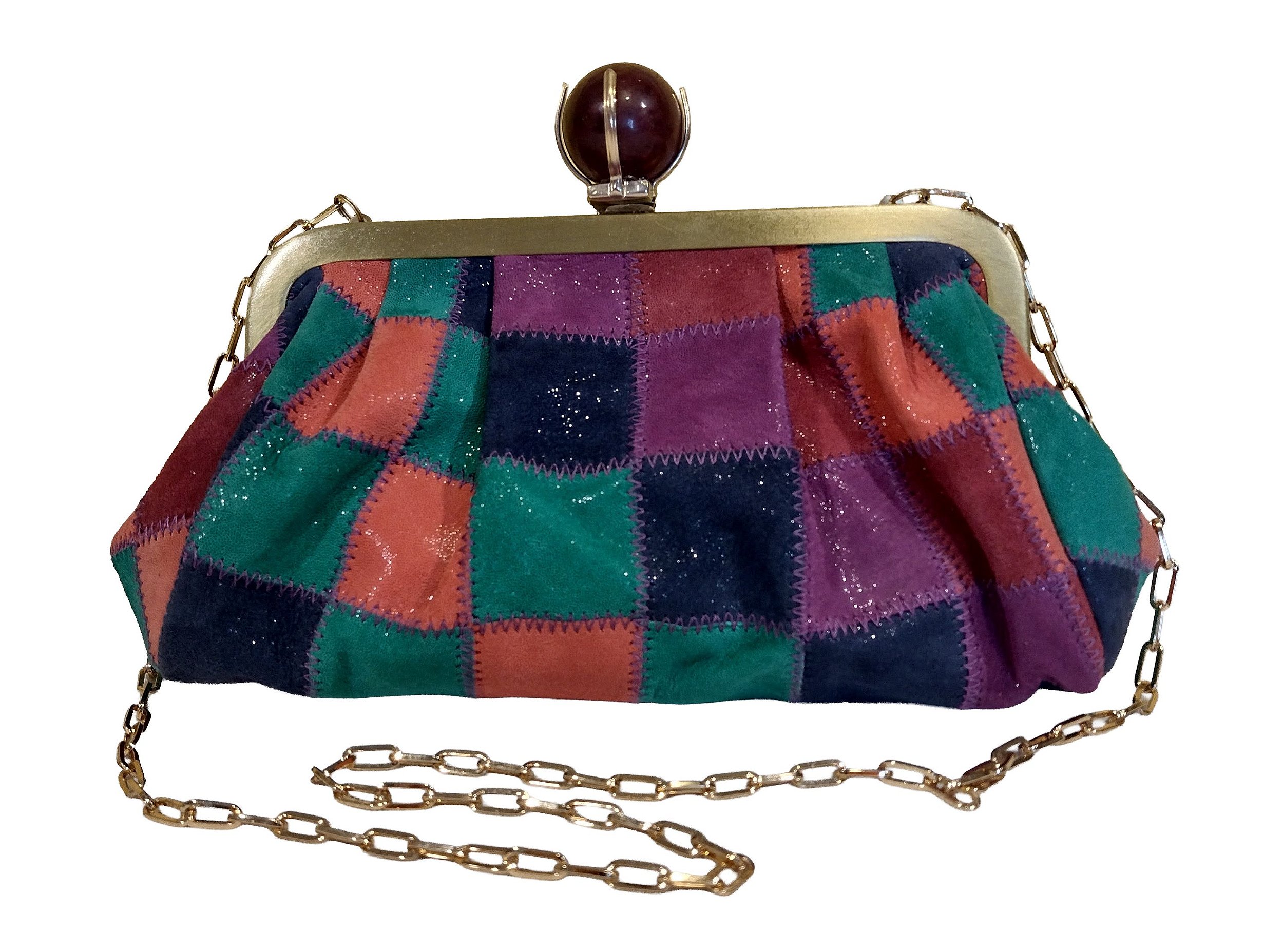 Clutch confecionada com patchwork de camurça de cabra metalizada minuciosamente costurado. Armação de metal com fecho de pedra esférica, jaspe vermeho. Possui alça tiracolo de corrente, com porta alça retrátil na armação. Uma clutch com toque de elegancia e notas de descontração, para diversos eventos.